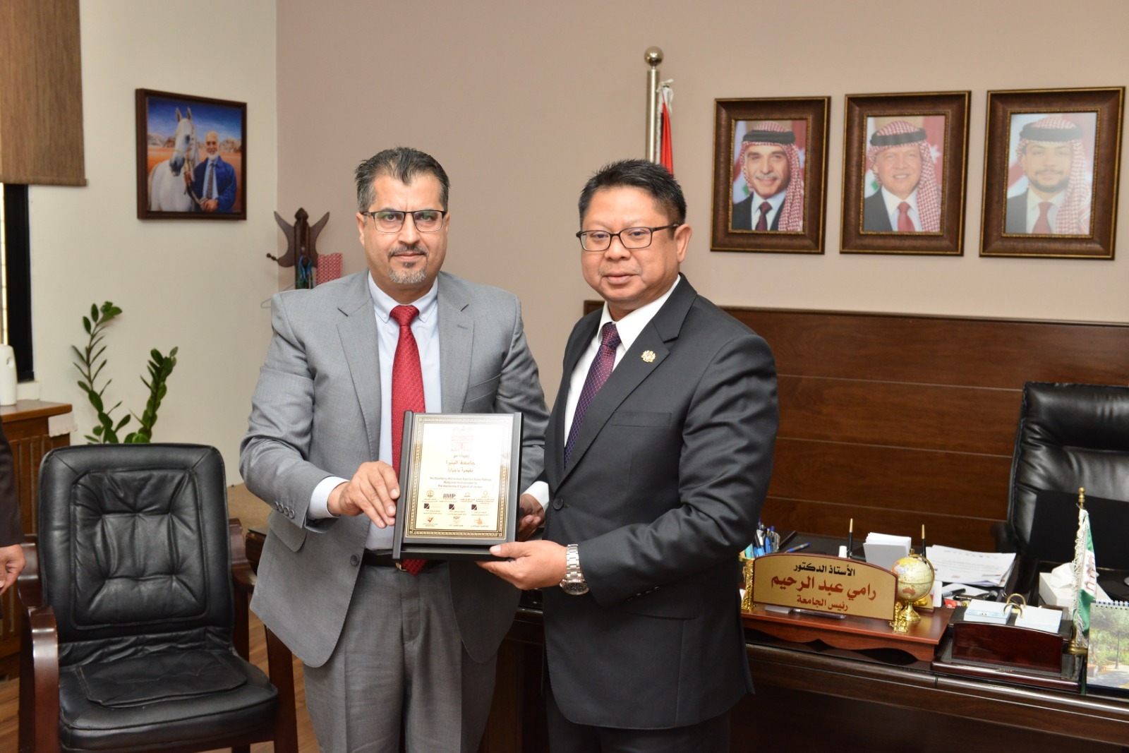 ورحب عبد الرحيم بالوفد الضيف مقدمًا نبذة عن نشأة الجامعة وكلياتها وتخصصاتها، واستعرض عبد الرحيم الاعتمادات المحلية والدولية التي حصلت عليها الجامعة، وقدم درع الجامعة التقديري إلى السفير الماليزي.
