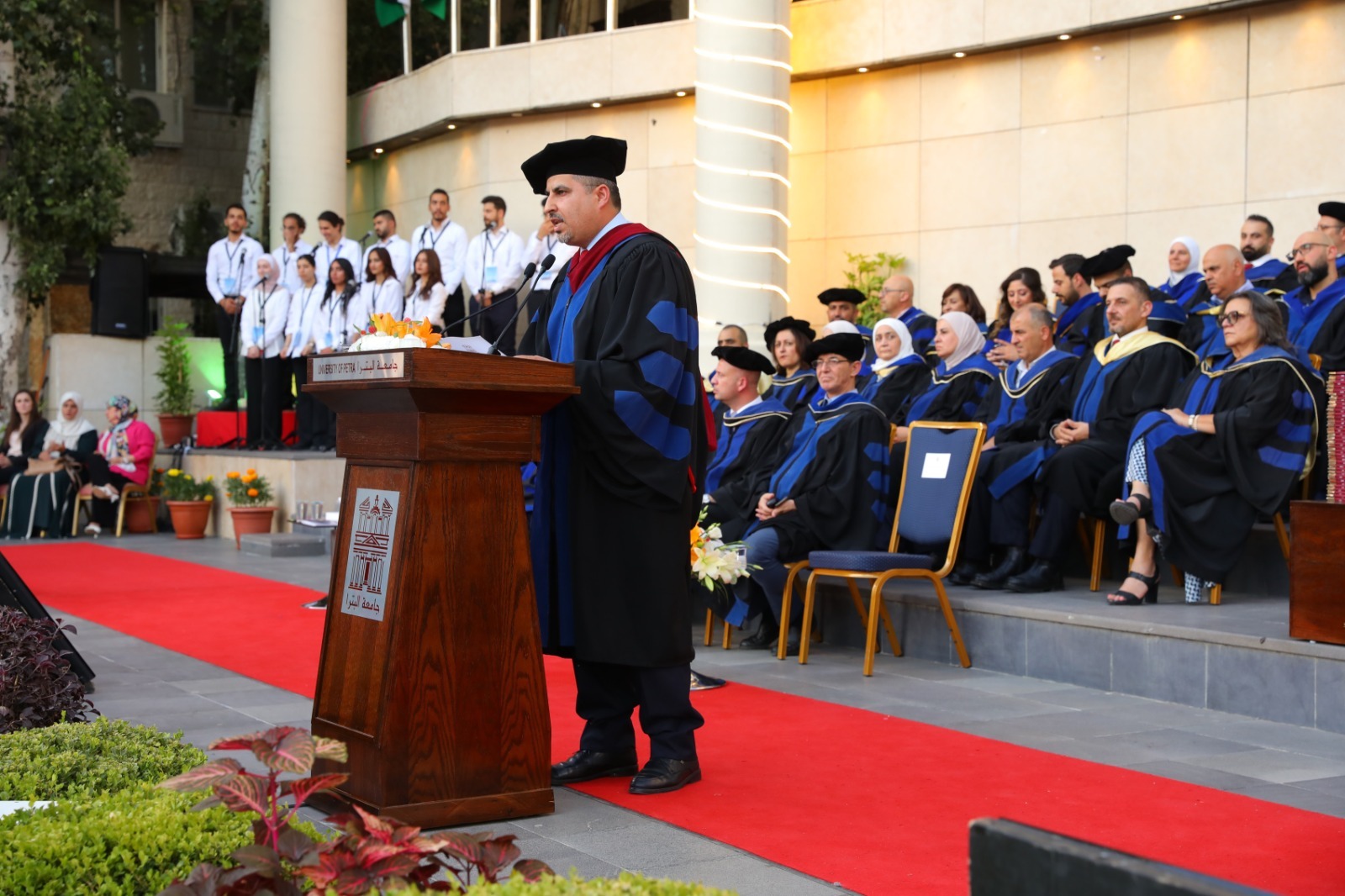 وأضاف عبد الرحيم: “لقدْ نهَلتمْ منْ بحرِ المعرفةِ في هذهِ الجامعةِ، وتزوَّدتمْ بالمهاراتِ والكفاياتِ التي تؤهِّلُكمْ للانخراطِ في سوقِ العملِ. فلتنضمّوا إلى مَنْ سبَقَكمْ وتسطِّروا قصصَ النجاحِ التي هيَ أغلى ما نملكُ، ولتتحلَّوا بقيمِ الجامعةِ المتمثلةِ بالتعلمِ منْ أجلِ المعرفةِ، واحترامِ التنوعِ والتعدُّديةِ والرأيِ الآخرِ، والالتزامِ بالعدالةِ والمسؤوليةِ الاجتماعيةِ، وتنميةِ القيادةِ، والخضوعِ للمساءلةِ والمحاسبةِ”.