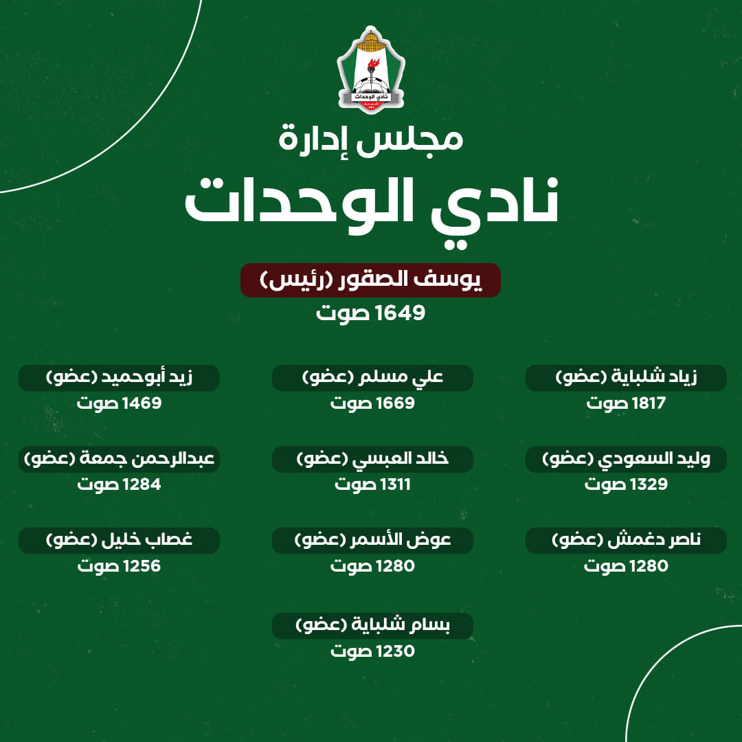 وبلغ عدد المقترعين في الانتخابات 3042 ناخب؛ وذلك بحسب صفحة نادي الوحدات الرسمية على منصة “فيسبوك”.