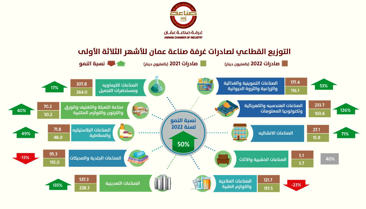 المستقل- -زادت صادرات غرفة صناعة عمان خلال الربع الأول من العام الحالي، بنسبة 50 بالمئة مدفوعة بزيادة صادرات غالبية القطاعات الصناعية.