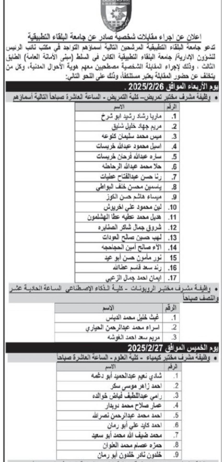 المستقل – دعت مؤسسات حكومية،الأحد مرشحين لاجراء المقابلات الشخصية لغايات استكمال التعيين. وكما أعلنت مؤسسات أخرى حاجتها لملء شواغر وظيفية لديها.
