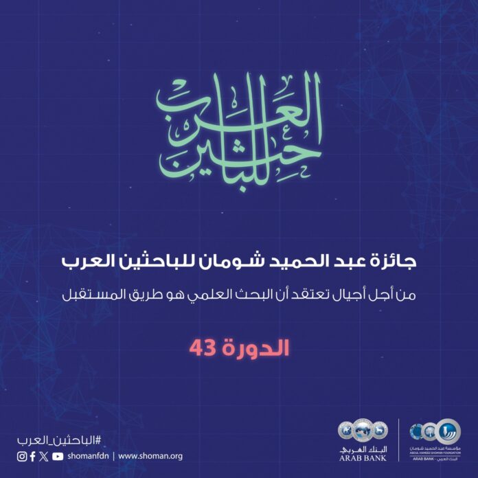 المستقل – أطلقت مؤسسة عبد الحميد شومان اليوم الأحد، جائزتها للباحثين العرب في دورتها الـ(43) للعام 2025، وفق ما أعلنت الهيئة العلمية للجائزة.