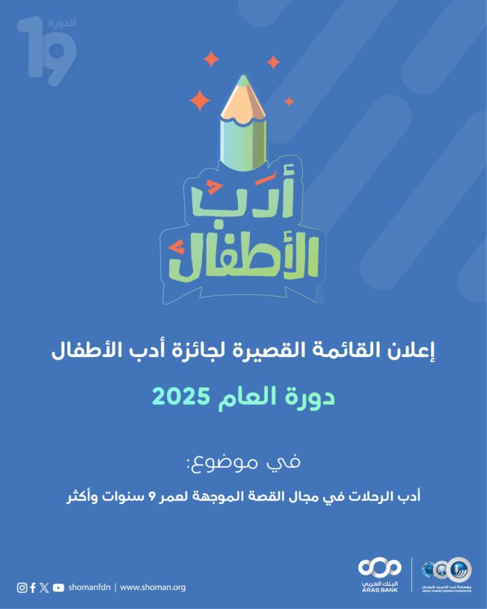 المستقل – أعلنت مؤسسة عبد الحميد شومان، اليوم، القائمة القصيرة لجائزتها لأدب الأطفال، للدورة 19 في موضوع “أدب الرحلات في مجال القصة الموجهة للأطفال في الفئة العمرية 9 سنوات وأكثر “، مؤكدة أن إعلان أسماء الفائزين بالمراتب الثلاث للجائزة سيكون في نهاية شهر آب.