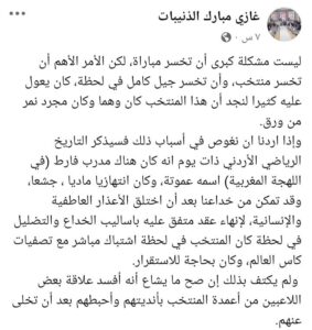واعتبر الذنيبات في تصريحه عبر صفحته الشخصية على فيس بوك رصدها “المستقل الإخباري”، عقب انتهاء مباراة النشامى ومنتخب الكويت ان كل ما يدور من إنتكاسات في صفوف المنتخب الوطني تعود للفترة الحرجة التي ترك بها عموته المنتخب ورشح مدرب لا يرقى لطموح منتخب كان يعول عليه الكثير من الأحلام.