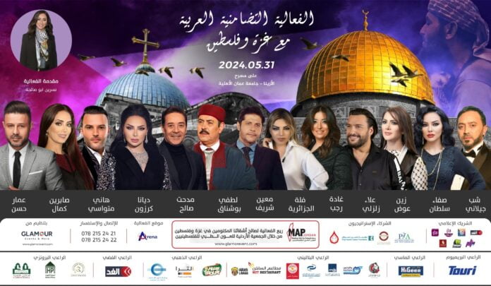 الاوبريت الغنائي الوطني يأتي ضمن الفعالية التضامنية العربية مع غزة وفلسطين ” فلسطين في وجدان الهاشميين “والذي ستبدأ فعالياته في العاشرة صباحا ،وينتهي مع الاوبريت الوطني، ويتضمن “بازار سوق فلسطين”، في فضاءات مسرح الارينا، إضافة الى معرض التضامن الطبي.