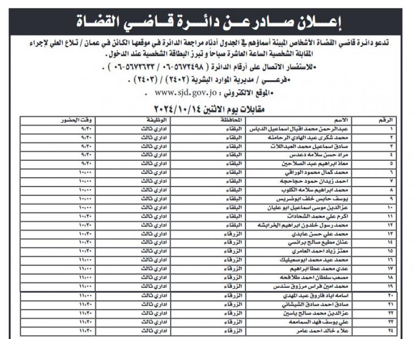 المستقل – دعت دائرة قاضي القضاة عدد من المرشحين لاشغال وظائف الى اجراء المقابلات الشخصية كما هو مبين في الاعلان ادناه :