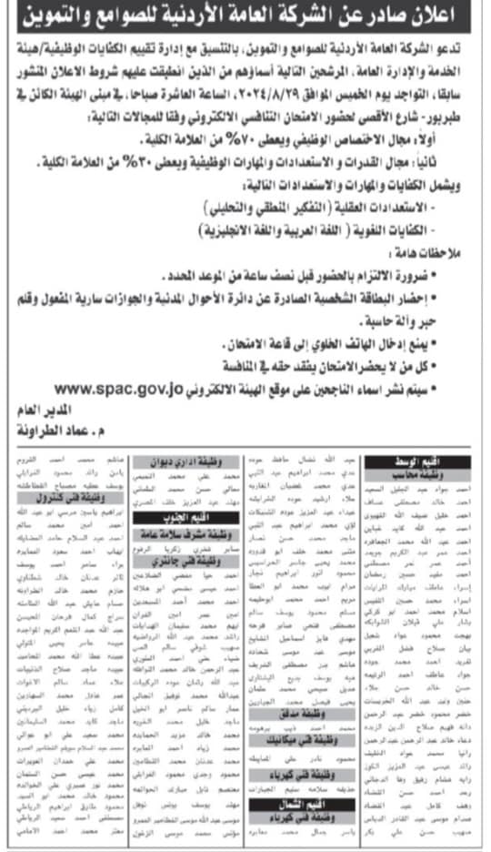 المستقل – دعت الشركة العامة الأردنية للصوامع والتموين بالتنسيق مع إدارة تقييم الكفايات الوظيفية / هيئة الخدمة والإدارة العامة ، المرشحين التالية أسماؤهم من الذين انطبقت عليهم شروط الإعلان المنشور سابقاً التواجد يوم الخميس الموافق 29/8/2024 ، الساعة العاشرة صباحا في مبنى الهيئة الكائن في منطقة طبربور – شارع الأقصى ، لحضور الامتحان التنافسي الالكتروني وفقاً للمجالات التالية .