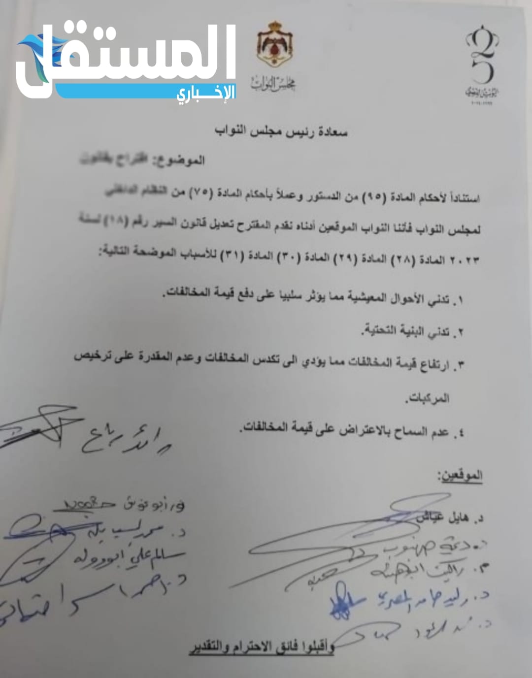 وعزا النواب الأسباب الموجبةلمقترح التعديل بحسب المذكرة التي وصلت للمستقل الإخباري؛ تدني الأحوال المعيشية مما يؤثر سلباً على دفع قيمة المخالفات، وتدني البنية التحتية، وارتفاع قيمة المخالفات، ما يؤدي إلى عدم المقدرة على ترخيص المركبات وعدم السماح بالاعتراض على قيمة المخالفات.