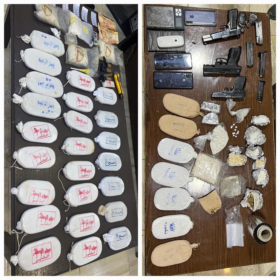 ففي القضية الأولى وبعد جمع المعلومات حول قيام أحد الأشخاص بالإتجار وترويج المواد المخدرة في البادية الشمالية، إذ تمت مداهمته وإلقاء القبض عليه وضُبط بحوزته 35 كف حشيش و 12 الف حبة كبتاجون مخدرة بالإضافة الى سلاح ناري.