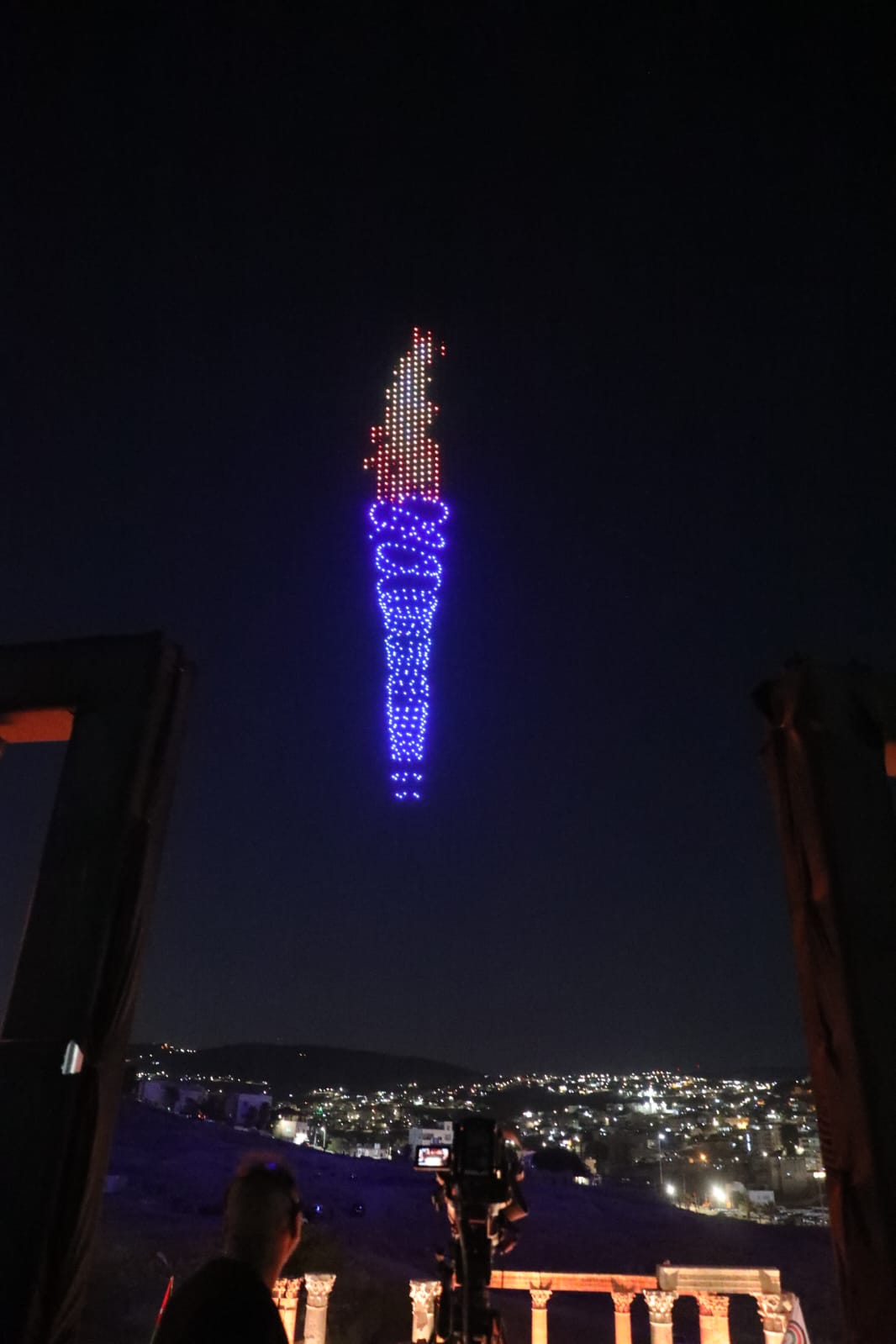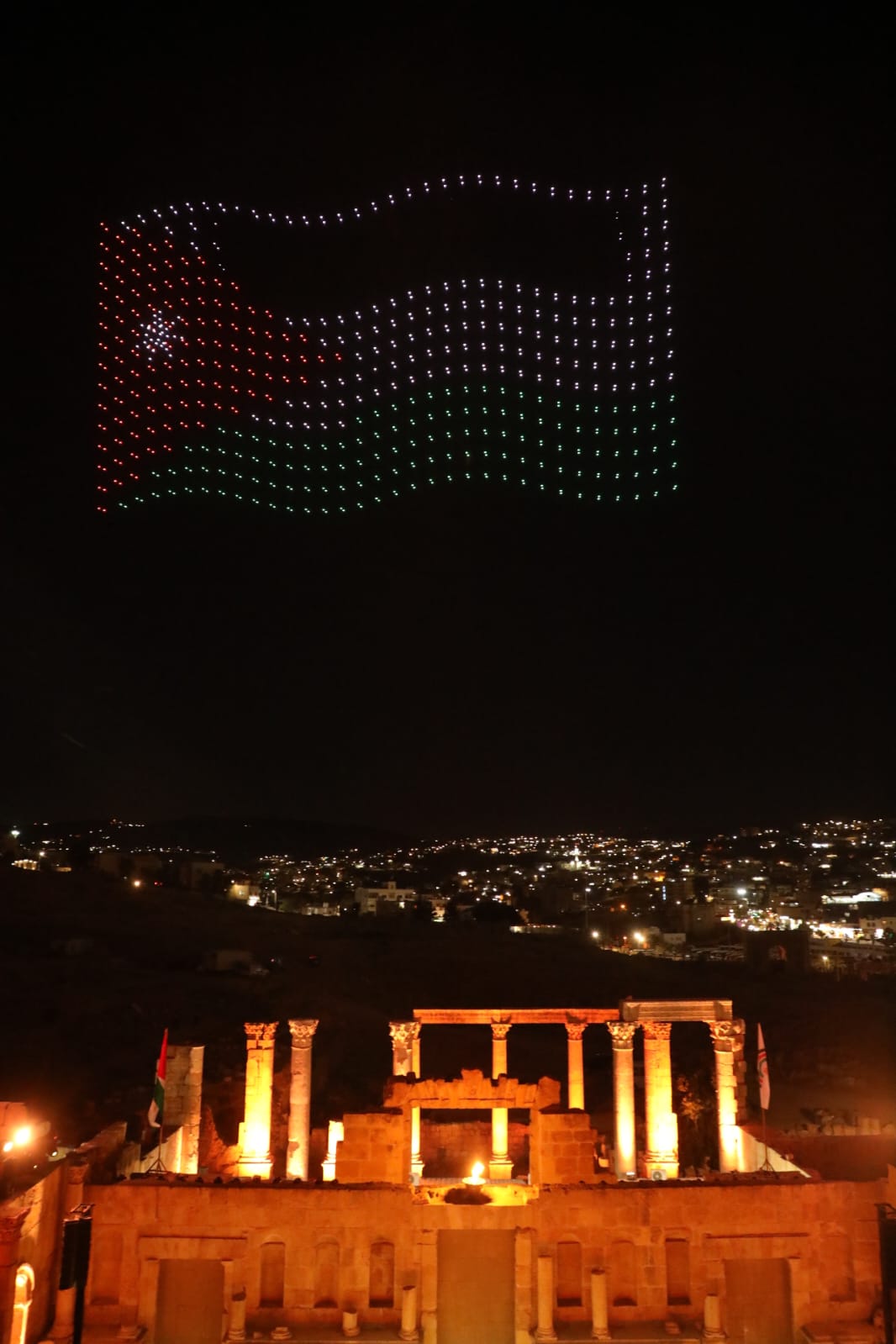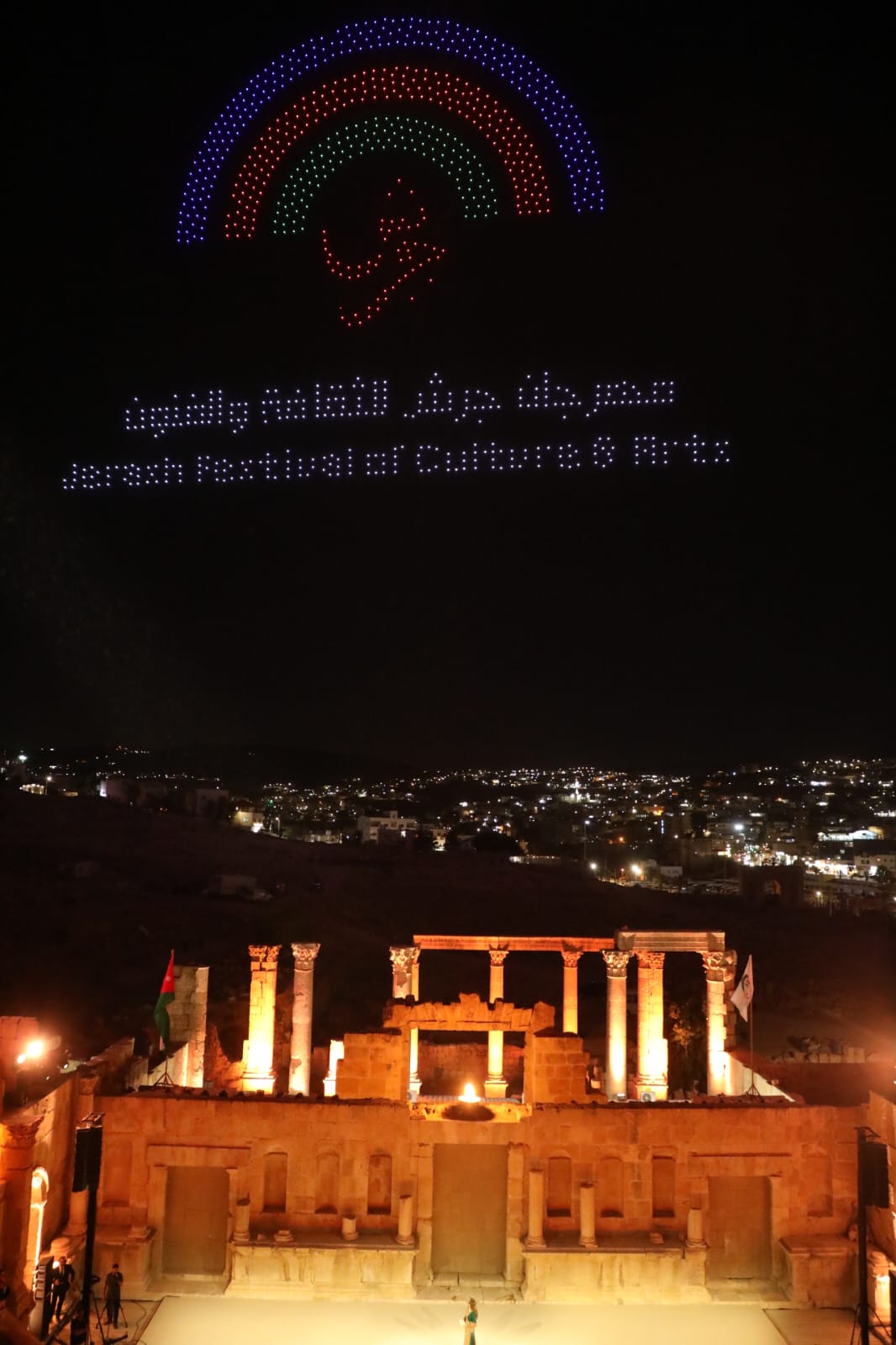 وتزيّنت سماء جرش بعروض دورن تضمنت صورا لجلالة الملك وولي العهد، وشعلة المهرجان وشعاره، وصورا للمدينة الأثرية، وعلم الأردن.