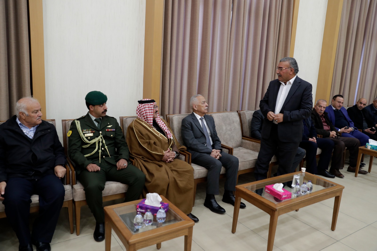 المستقل – مندوبا عن جلالة الملك عبدالله الثاني، وسمو الأمير الحسين بن عبدالله الثاني، ولي العهد، قدم رئيس الديوان الملكي الهاشمي يوسف حسن العيسوي، اليوم الثلاثاء، واجب العزاء إلى عشيرة الحوراني بوفاة العميد الطيار المتقاعد عبدالله محمد الحوراني، وإلى عشيرة أبو عبيد بوفاة الإعلامي محمود سليم أبو عبيد.