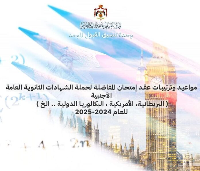 المستقل – أعلنت وحدة تنسيق القبول الموحد في وزارة التعليم العالي عن موعد وترتيبات عقد امتحان المفاضلة المقرر للطلبة الأردنيين الحاصلين على معدلات متساوية في شهادة الدراسة الثانوية العامة الأجنبية للعام الجامعي 2024-2025.
