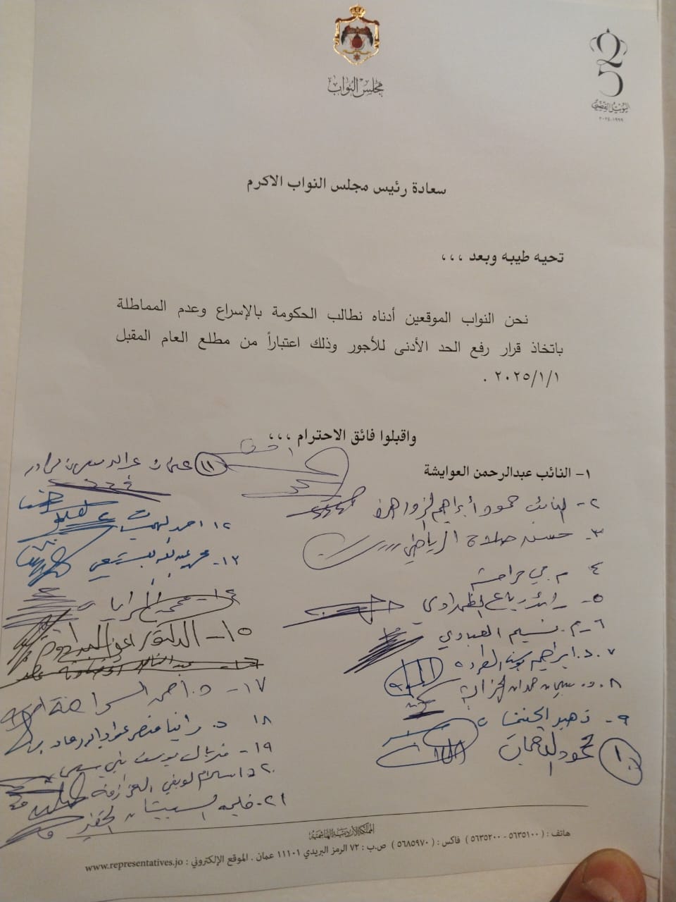 دعا عدد من النواب ضمن مذكرة تبناها النائب عبد الرحمن العوايشة، اليوم الاثنين، الحكومة إلى الإسراع وعدم المماطلة باتخاذ قرار رفع الحد الأدنى للأجور، اعتبارًا من مطلع العام المقبل 2025.