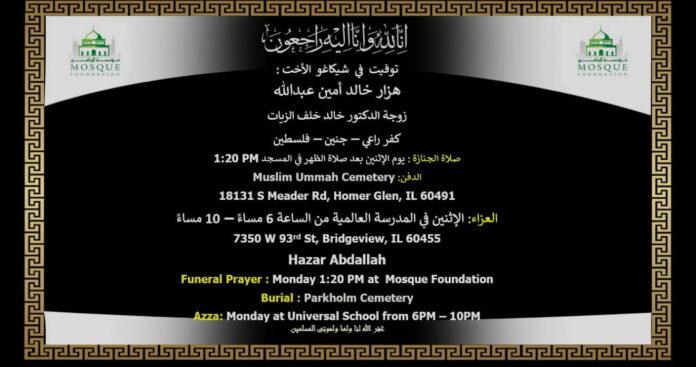 وتوفيت الفاضلة هزار اليوم الجمعة في مدينة شيكاغو الأمريكية، وستقام صلاة الجنازة على الفقيدة بعد صلاة ظهر يوم الاثنين القادم .