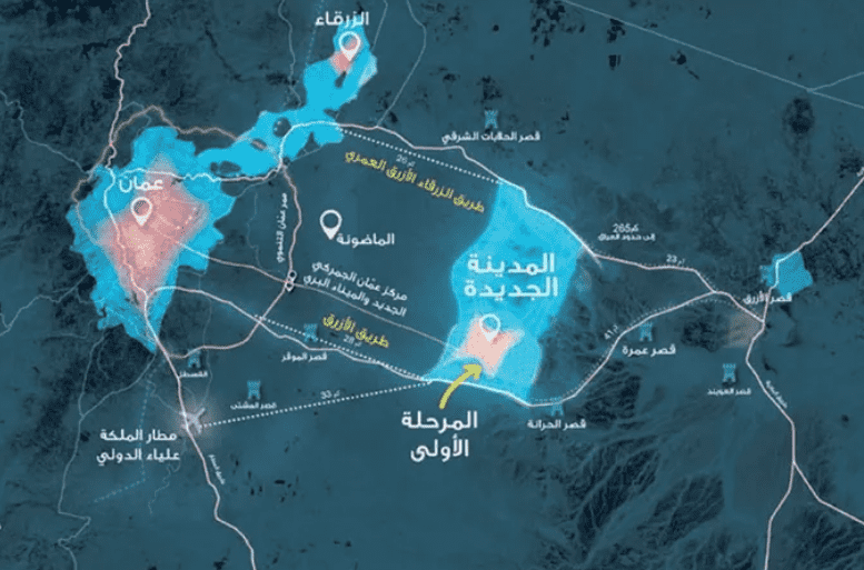 ونشرت الحكومة السابقة العام الماضي، خريطة توضيحية لموقع المدينة الجديدة، الذي يبعد نحو 40 كم عن وسط عمان، و27 كم عن مطار الملكة علياء، و31 كم عن مدينة الزرقاء.
