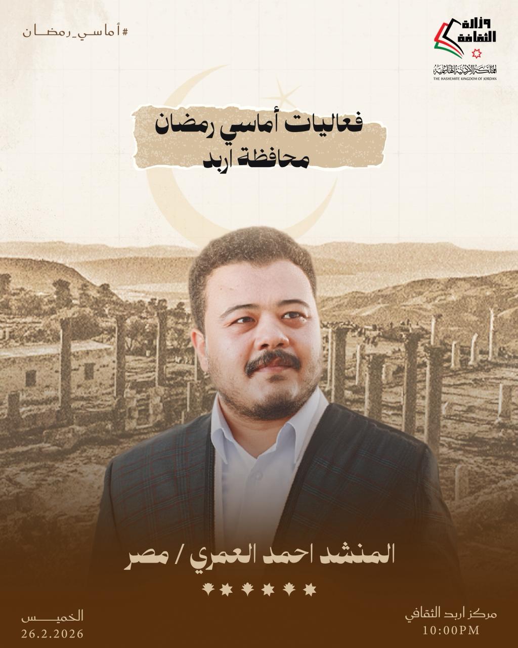 أما في محافظة إربد، فيحيي المنشد المصري أحمد العمري أمسية إنشادية عند الساعة العاشرة مساءً على مسرح مركز إربد الثقافي.