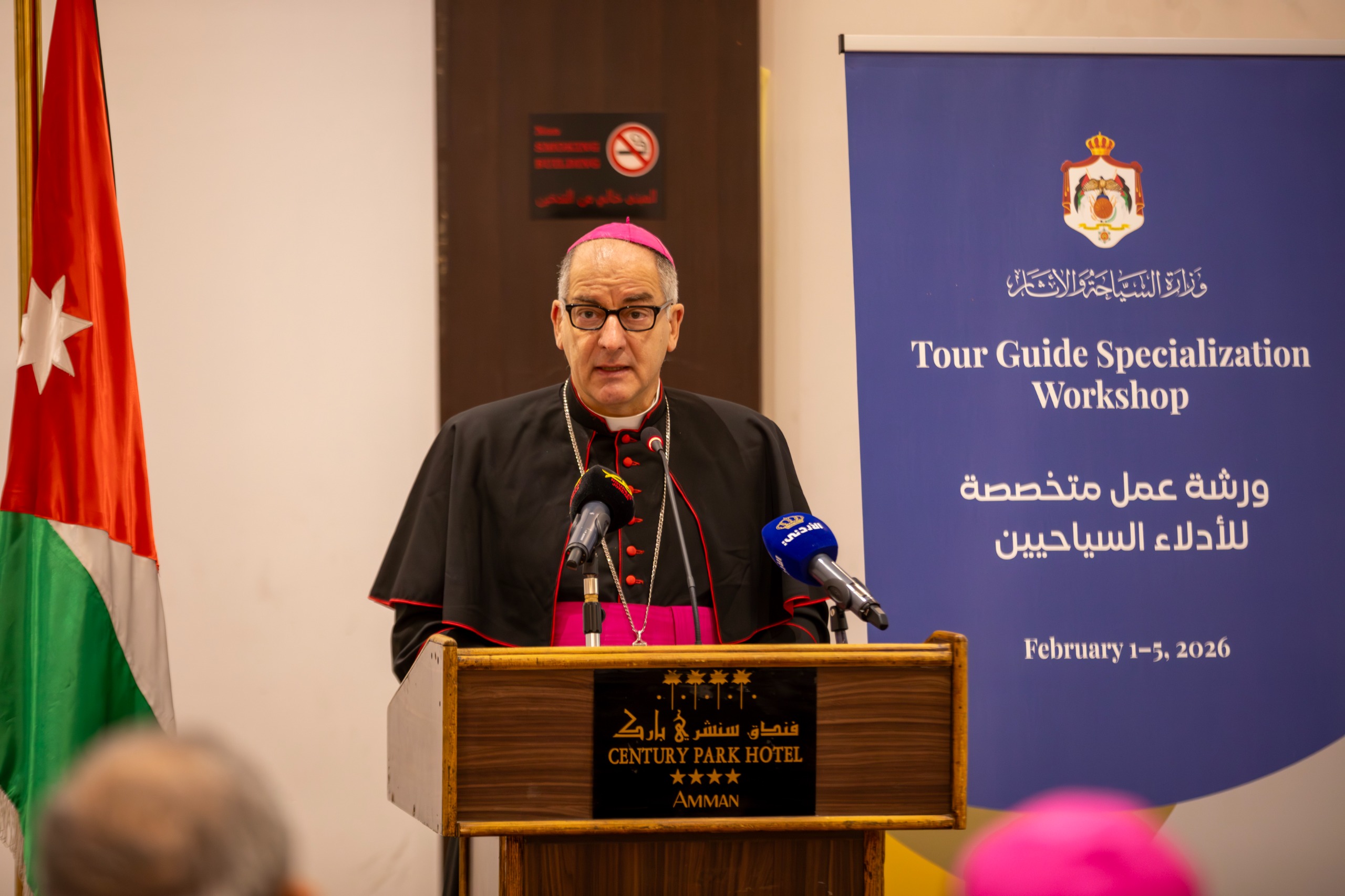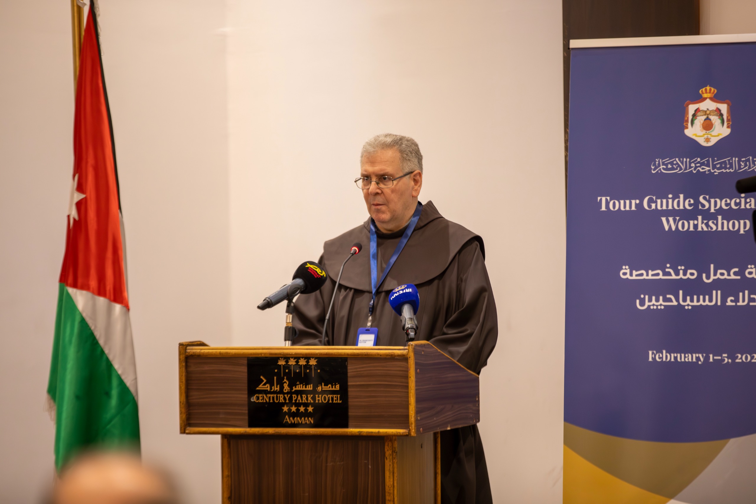 من جانبه، أعرب ممثل حراسة الأراضي المقدسة في الأردن الأب فرانشسكو باتون، عن بالغ الامتنان لجلالة الملك عبدالله الثاني المعظم على رعايته الدائمة للأماكن المقدسة، لافتاً الى أن الهدف من هذا التعاون يتمثل في إعداد أدلاء سياحيين لا يقتصر دورهم على امتلاك الخبرة التقنية، بل يمتد ليكونوا رواة أصيلين لقيمة القداسة المرتبطة بالمواقع الدينية.