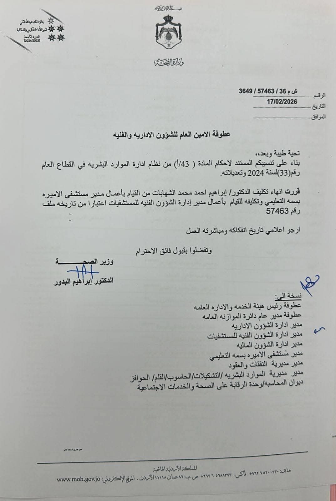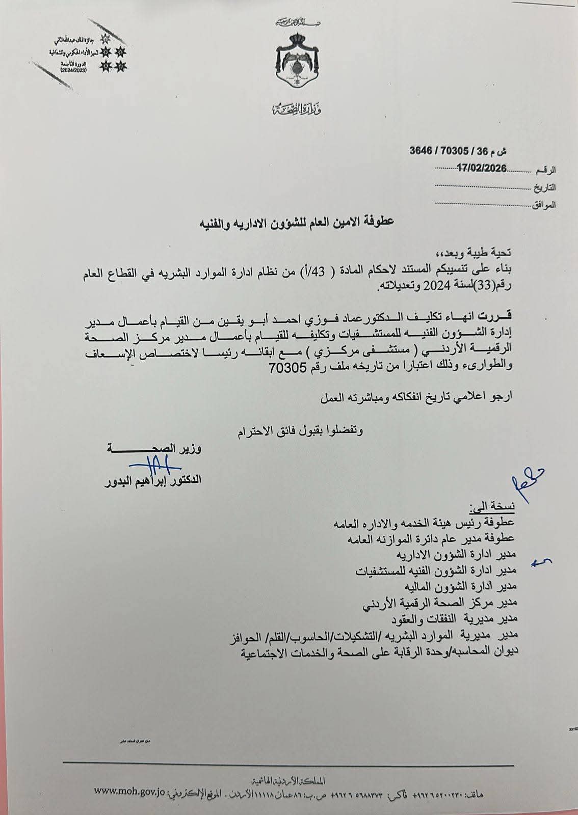 قرر وزير الصحة الدكتور ابراهيم البدور انهاء تكليف عدد من المدراء في وزارة الصحة ، وذلك اليوم الثلاثاء الموافق 17/2/2026 .