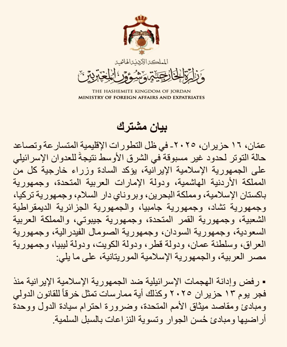 في ظل التطورات الإقليمية المتسارعة وتصاعد حالة التوتر لحدود غير مسبوقة في الشرق الأوسط نتيجةً للعدوان الإسرائيلي على الجمهورية الإسلامية الإيرانية، يؤكد وزراء خارجية الأردن، والإمارات، وباكستان، والبحرين، وبروناي دار السلام، وتركيا، وتشاد، وجامبيا، والجزائر، وجزر القمر، وجيبوتي، والسعودية، والسودان، والصومال، والعراق، وسلطنة عمان، وقطر، والكويت، وليبيا، ومصر، وموريتانيا على رفض وإدانة الهجمات الإسرائيلية ضد إيران منذ فجر يوم 13 حزيران 2025، وأية ممارسات تمثل خرقاً للقانون الدولي ومبادئ ومقاصد ميثاق الأمم المتحدة، وضرورة احترام سيادة الدول ووحدة أراضيها ومبادئ حُسن الجوار وتسوية النزاعات بالسبل السلمية.