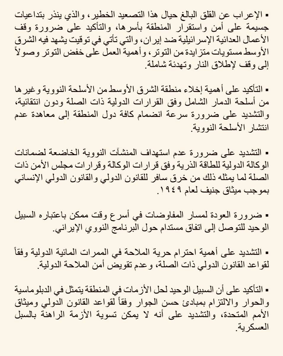 وأعربوا عن القلق البالغ حيال هذا التصعيد الخطير، والذي ينذر بتداعيات جسيمة على أمن واستقرار المنطقة بأسرها، والتأكيد على ضرورة وقف الأعمال العدائية الإسرائيلية ضد إيران، والتي تأتي في توقيت يشهد فيه الشرق الأوسط مستويات متزايدة من التوتر، وأهمية العمل على خفض التوتر وصولاً إلى وقف لإطلاق النار وتهدئة شاملة.
