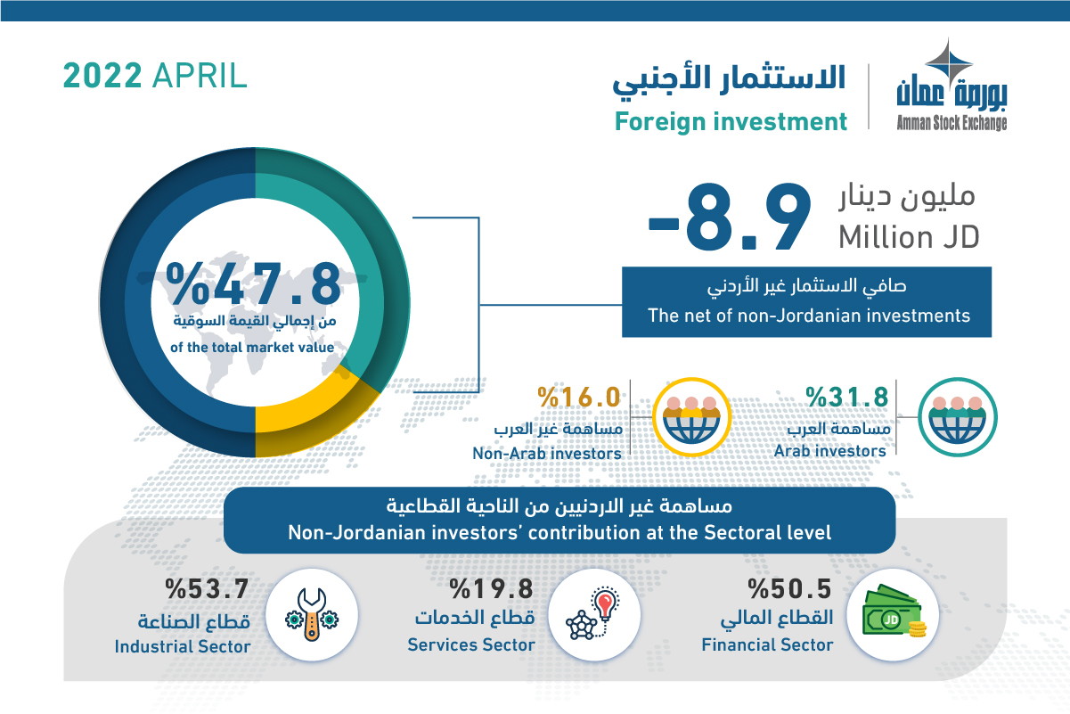 وعليه تصبح نسبة مساهمة المستثمرين غير الأردنيين في الشركات المدرجة في البورصة في نهاية شهر نيسان 2022 حوالي 47.8% من إجمالي القيمة السوقية، وبنسبة 37.2% للمؤسسات الاعتبارية الاستثمارية من شركات ومؤسسات وصناديق. وشكلت مساهمة العرب ما نسبته 31.8%، ومساهمة غير العرب 16.0% من إجمالي القيمة السوقية للبورصة. أما من الناحية القطاعية، فقد بلغت نسبة مساهمة المستثمرين غير الأردنيين في الشركات المدرجة في البورصة للقطاع المالي 50.5%، ولقطاع الخدمات 19.8%، ولقطاع الصناعة 53.7%.